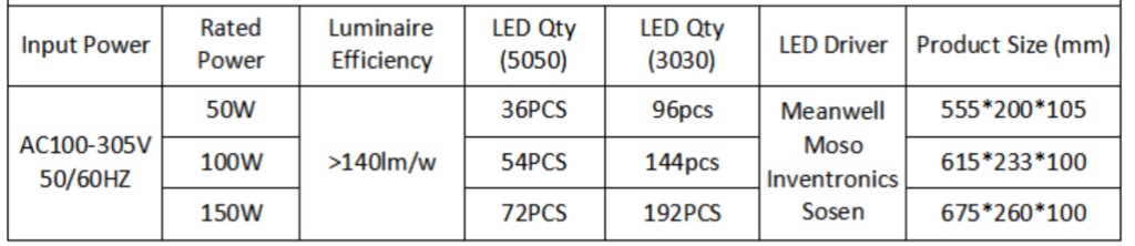 LED chips: CREE/Osram/Lumileds/Bridgelux SMD3030 optional. Lumileds, Bridgelux 5050 optional, 5050 chips lifespan is much longer than 3030 chips, 8 big chip cores in one 5050 chip.