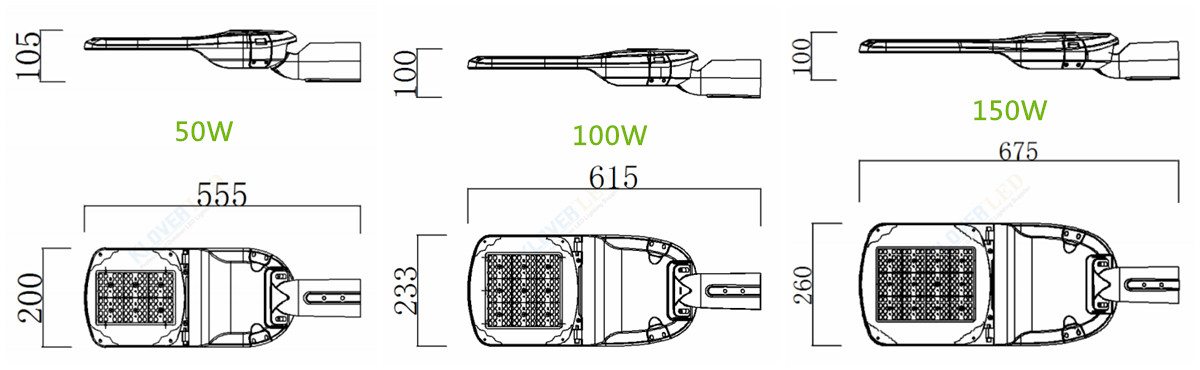 Product size for Outdoor Waterproof IP65 Adjustable 50W 100W 150W LED Street Light