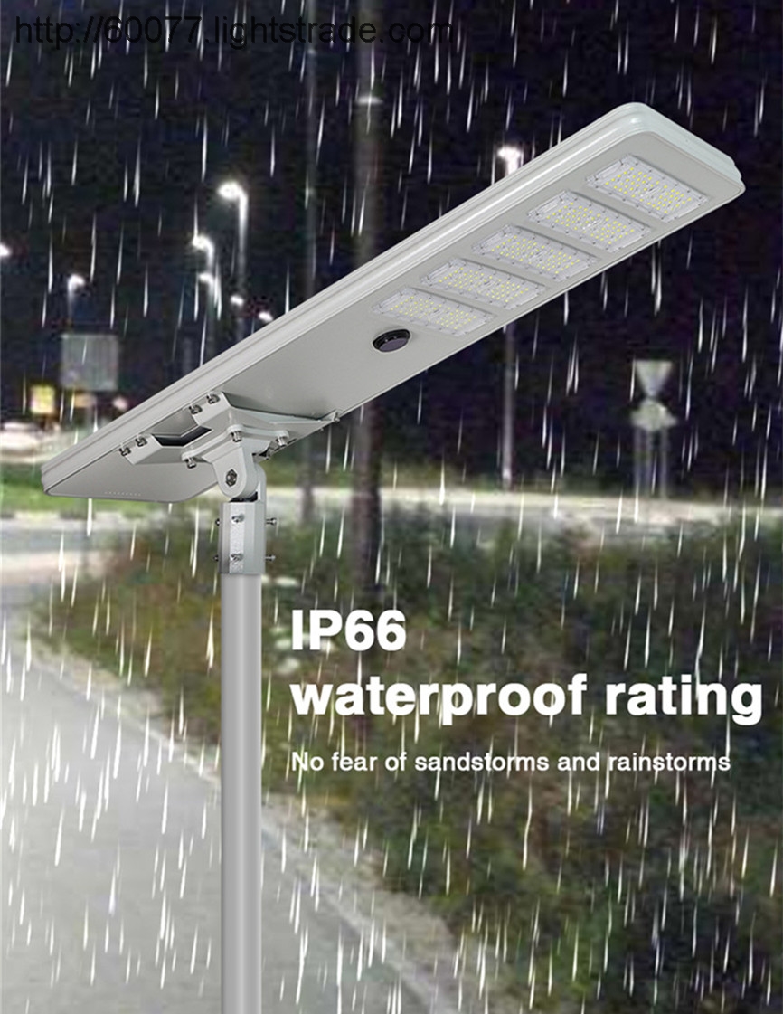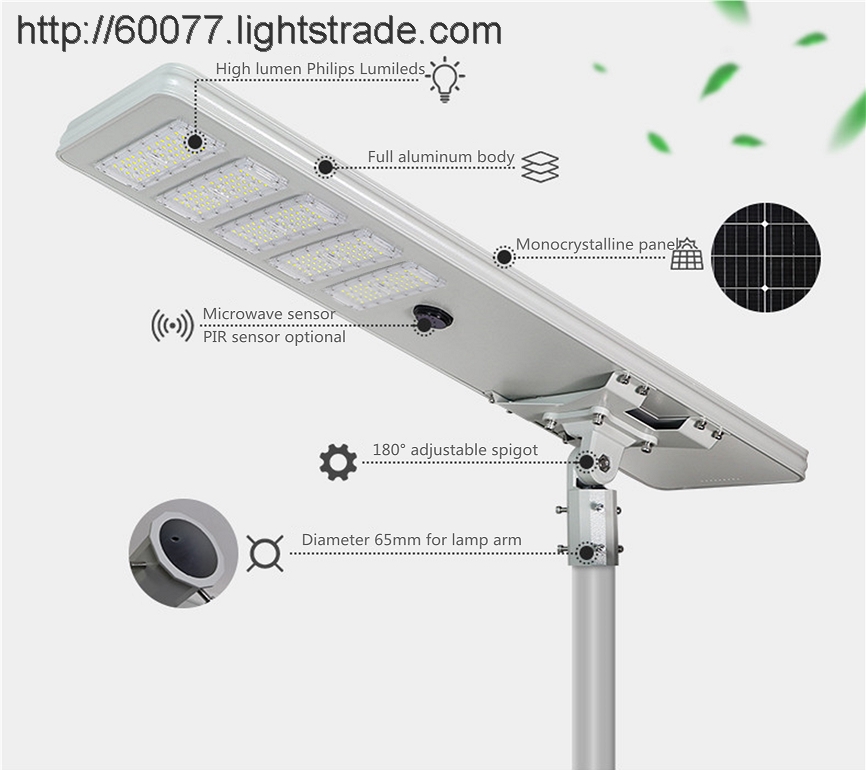 1.  Slim design, mono-crystalline silicon solar panel, LM-80 listed Philips Lumileds SMD2835 chips, PIR or microwave motion sensor, new A1 grade LiFePo4 battery, MPPT controller are integrated all in one lamp body, slim design, thickness is 45mm, can resist strong wind.