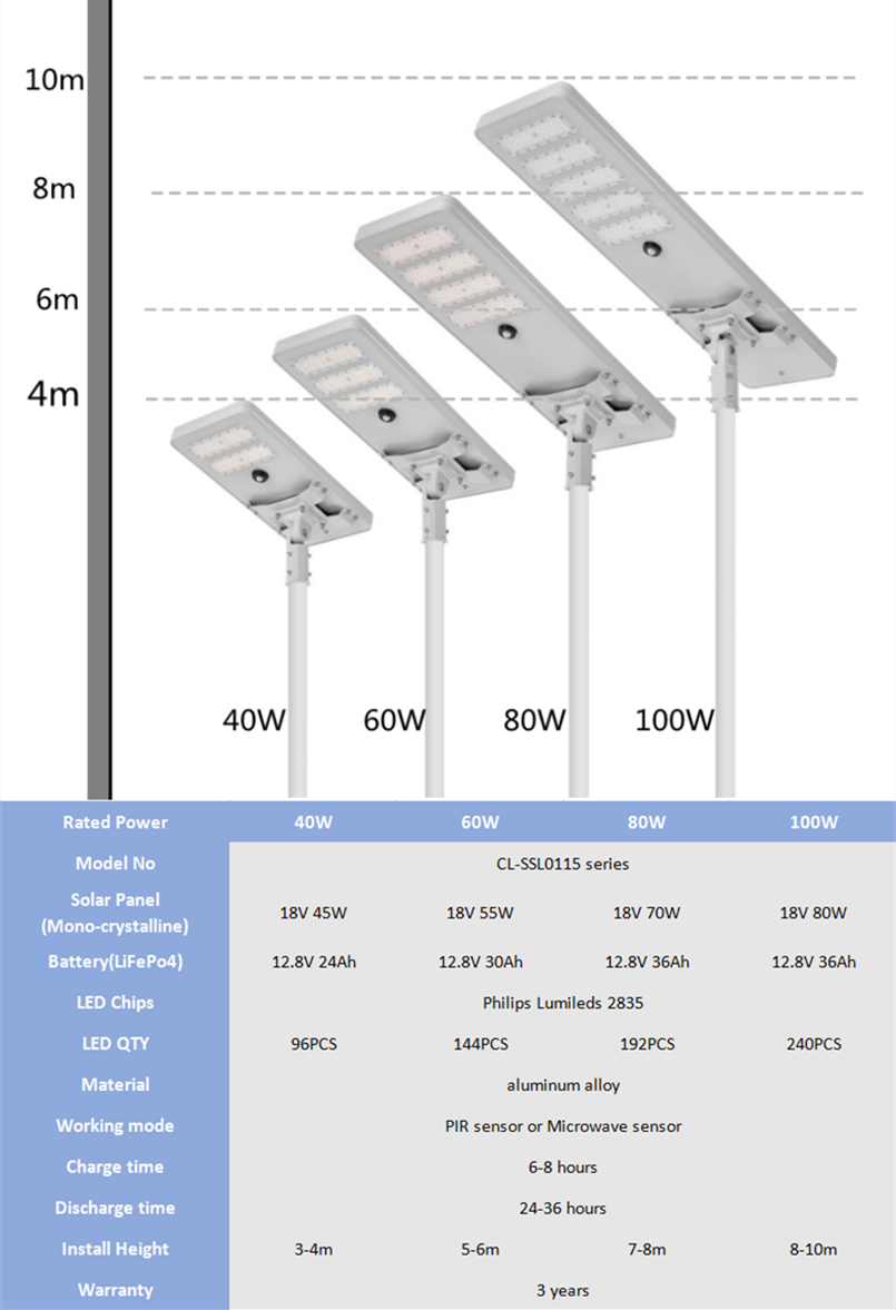 Installation height for 40W 60w 80w 100w all in one solar LED street light
