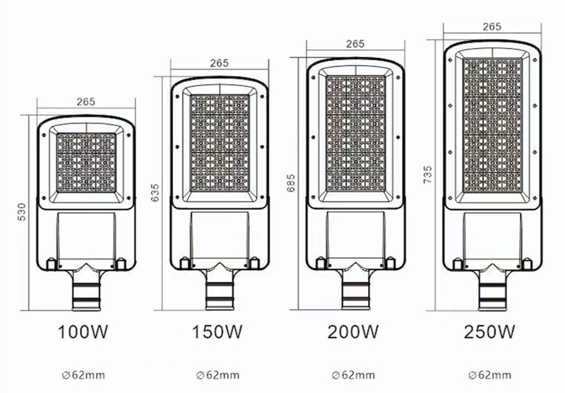 Product Size for Factory Direct China Supplier Aluminum 100W 150W 200W 250W LED Street Light