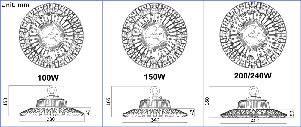 Product size for 100W 150W 200W 240W factory warehouse lighting ufo LED high bay ligh